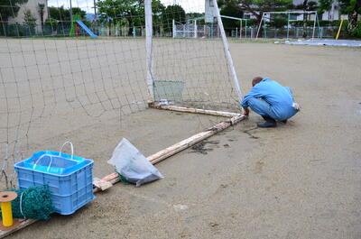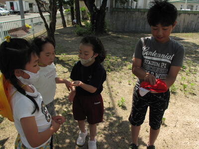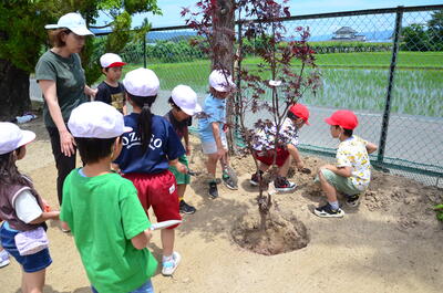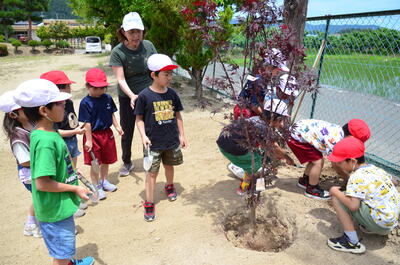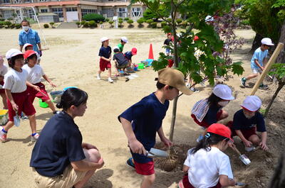 昨日は1・2年生が校庭の東側に植樹を行いました。生活科の学習で活用するため、モミジとかえでの木を植えました。用務職員さんに手伝ってもらい、「元気に大きく育ってね。」と願いを込めながら、土をかけていました。