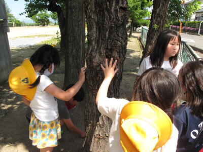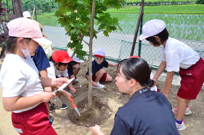 2023年6月21日 12時00分昨日は1・2年生が校庭の東側に植樹を行いました。生活科の学習で活用するため、モミジとかえでの木を植えました。用務職員さんに手伝ってもらい、「元気に大きく育ってね。」と願いを込めながら、土をかけていました。