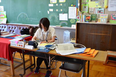 子どもたちの教育活動に直接かかわっているのは、担任や授業を行う先生です。しかし、学校にはその教育活動をサポートしている職員がいます。教育環境を安全にきれいにしている用務職員、様々な面から子どもたちの健康を指導・支援している養護教諭、教育活動がスムーズに進むよう事務的な業務を行う主査(休み時間には子どもと遊びます)、担任が笑顔で子どもとかかわれる時間を生むためにサポートしているスクールサポートスタッフ、活用しやすい図書館経営をし子どもの読書活動をサポートしている学校司書、いろいろな教材を準備し英語や外国の文化をおしえてくれるALT。子どもの笑顔と成長のために、それぞれの仕事を頑張っています。