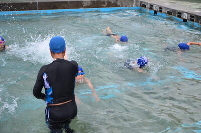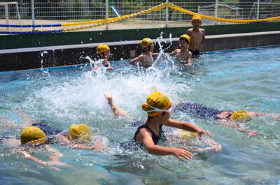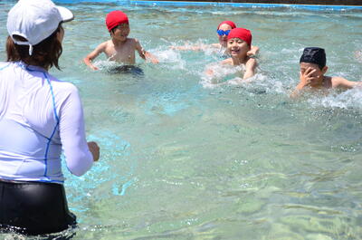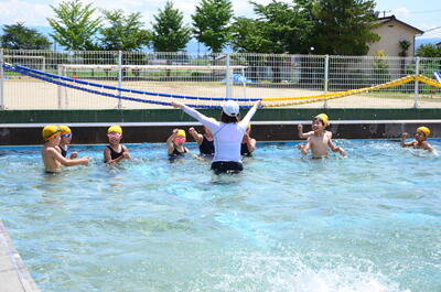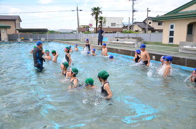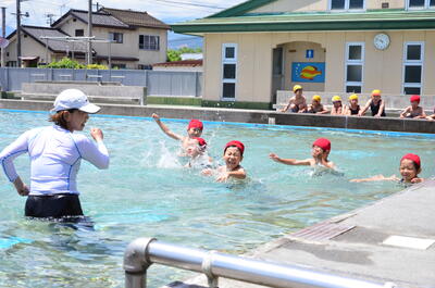 今日はプールでの学習に絶好のコンディション。1・2年生の体育の学習の様子です。1年生は今日が2回目のプールでの学習ですが、水を怖がらず水中をしっかり歩いていました。表情を見ると楽しんでいる様子です。2年生はさすがです。水中に顔をつけたり、泳いだりしていました。みんな、先生のお話をしっかり聞いて学習に取り組んでいます。