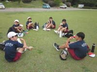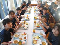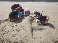 その後、自然の家に到着。お昼を済ませて四倉海水浴場に移動し、野外活動の一つ、「砂の芸術」に取り組みました。3つの班の作品の題材は、「亀、イルカ、鯨」と決まり、全員時間を忘れて作品作りに取り組みました。この日の夜は、自然の家のバイキング。たくさんお替りをした子もいました。