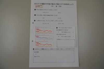 次はいよいよ「かね(カリヨン)」を聴きます。先生が準備したワークシートに沿って視点を持ちながら、繰り返し演奏動画を鑑賞しながら曲の構成や音の強さの変化、楽器の音色、各部分の感じについてイメージを高めていきました。第一にかねの音を演奏しているのはホルンであることをとらえました。第二にかねの音が続いているかどうかを視点として、曲の構成がピザトースト型ではなくサンドイッチ型(ア-イ-ア)であることをとらえました。第3にアとイのふしを比べ、強く演奏されているものや明るく軽やかに演奏されているものはアであることをとらえました。最後に曲の紹介文を乾燥や曲のつくりを視点としてまとめました。アは結婚式をイメージして作られたものだということを知り、授業は終わりました。耳と心を十分に使い、音(音楽)のリーディングスキルを高めた子どもたちです。