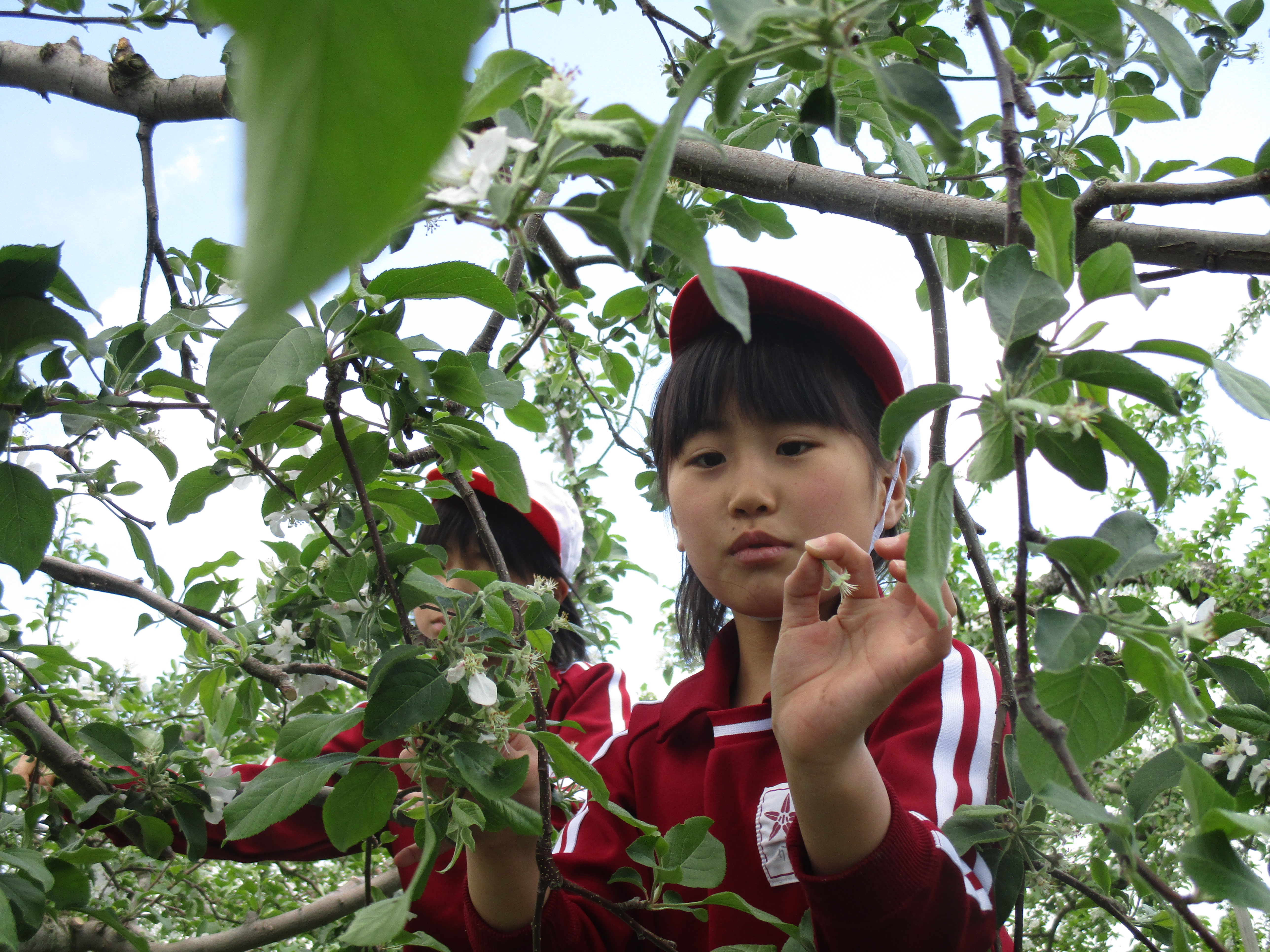 3年生は、総合的な学習の時間「レッツ・ゴー 大笹生探検」で、大笹生地区の特産である「りんご」について学び始めました。4月26 日は、果樹農家の阿部さんの畑で、りんごの花の摘花作業をしました。真剣に、そして、楽しそうに作業に取り組む子どもたちの姿を見て、農業の未来は明るいと感じました。