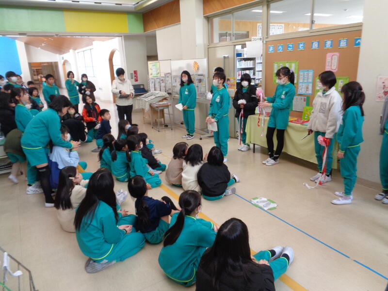校長あいさつ、図書委員長あいさつの後、再オープンを記念してテープカットを行いました。