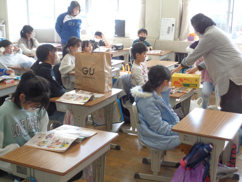 図書電算化に伴い、学校にある膨大な数の図書の背ラベル貼付を保護者のボランティアの方に作業していただいています。ありがとうございます。