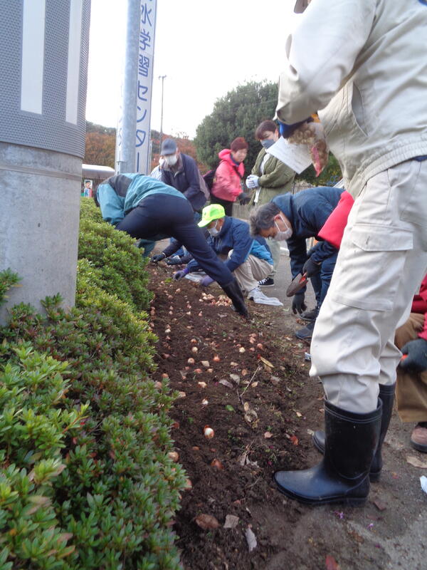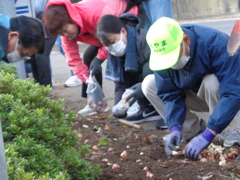 午前7時より、御山小学校区青少年健全育成推進会環境浄化部の皆様に、歩道花壇と校門花壇の除草、そして球根を植えていただきました。ありがとうございました。