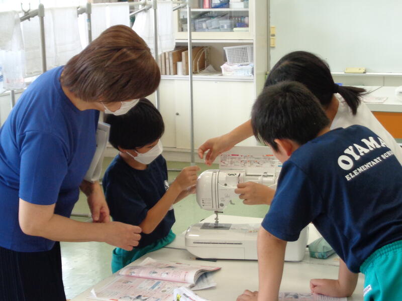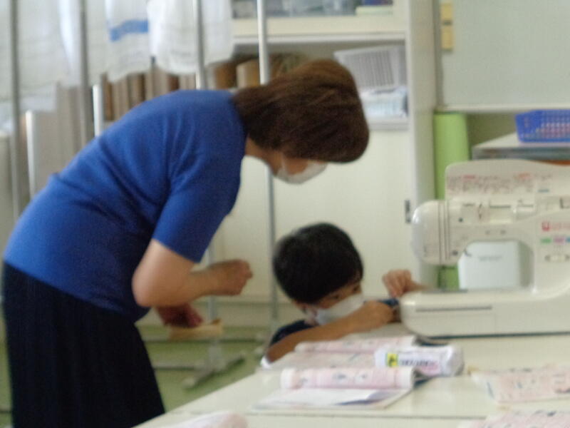 初めてのミシンの学習。ソーイングボランティアの方にミシンを安全で正しく使うためにご指導いただきました。