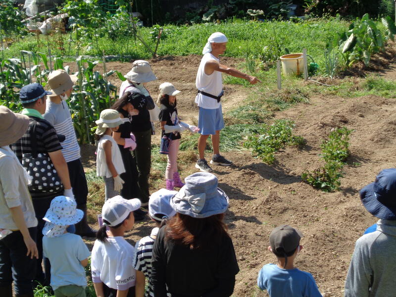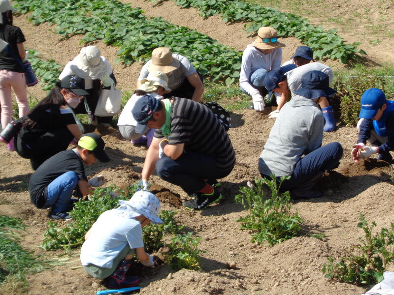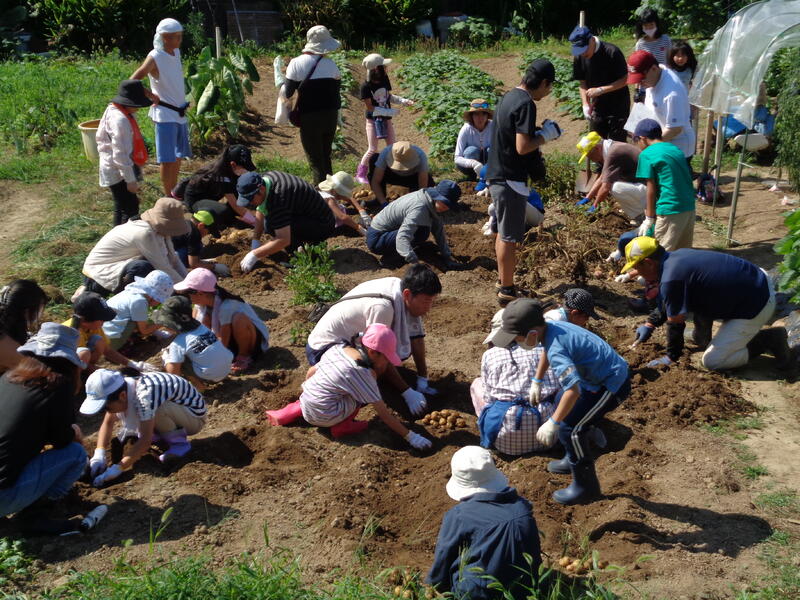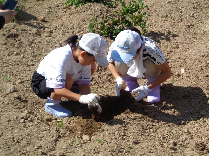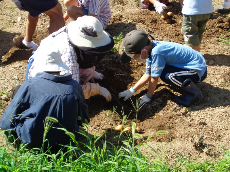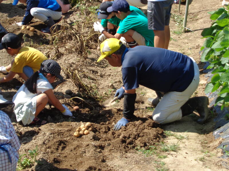 昨日、御山小ふれあい農園でジャガイモ掘り体験を行いました。栽培支援ボランティアの指導を受けながら、メークインとキタアカリを収穫しました。
