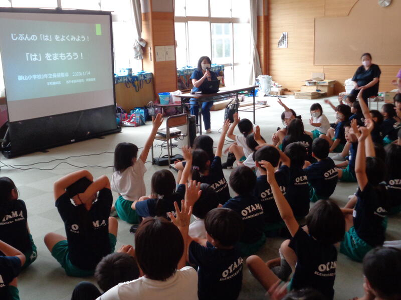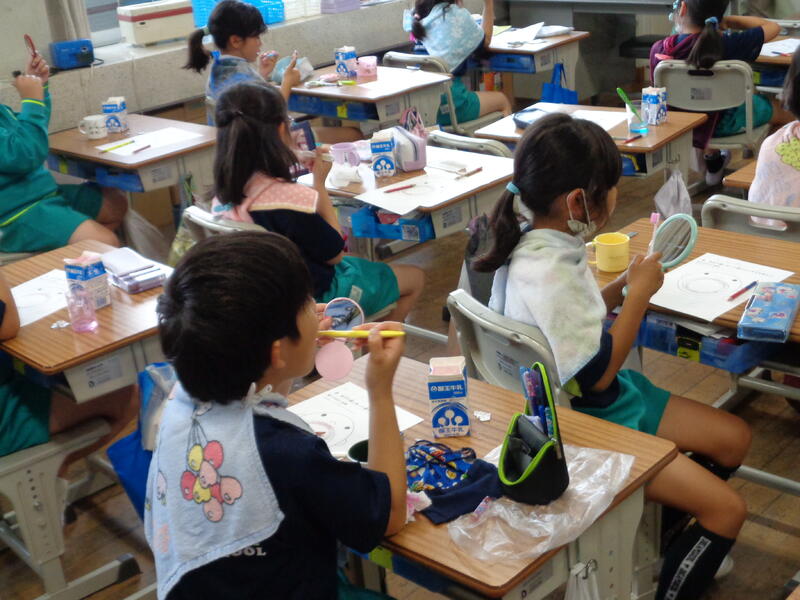 2023年6月14日 14時58分学校歯科医の阿部先生を招き、3年生の歯科指導を行いました。鏡を見ながら、ピンクに染まったところをブラッシングしました。自分の歯にあった歯の磨き方を学びました。