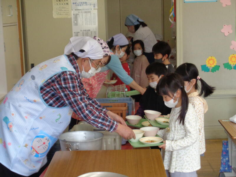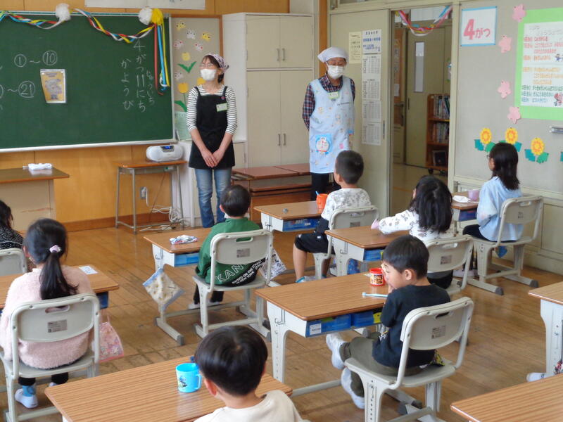 今日から1年生の給食が始まりました。今日のメニューは、カレーライス、和風サラダ、牛乳、ヨーグルトでした。給食ボランティアの5名の方に、身支度、配膳、後片付け等でお世話になりました。子どもたちは、給食を楽しみ、食べることができ、ご飯とカレーは残りませんでした。ボランティアの皆様ありがとうございました.。明日もよろしくお願いします。