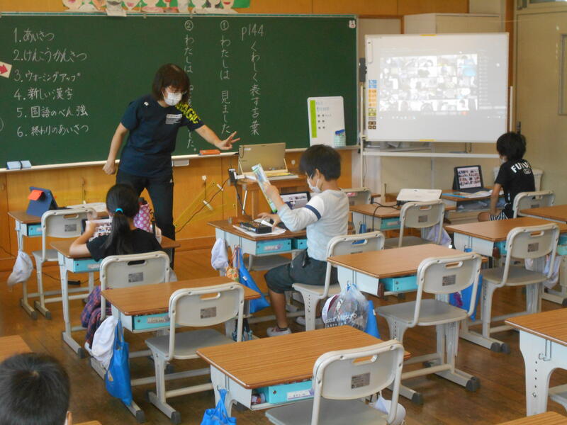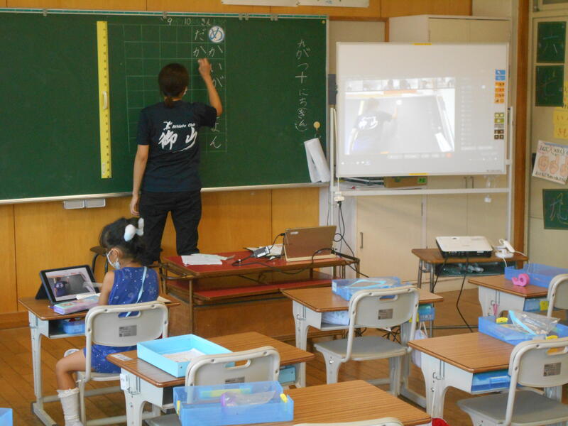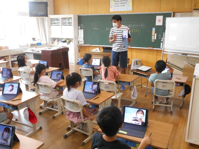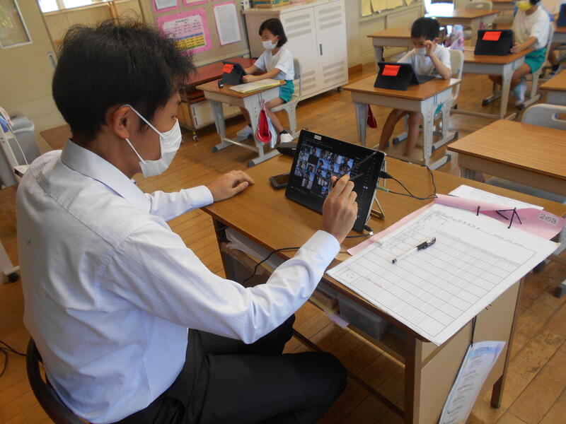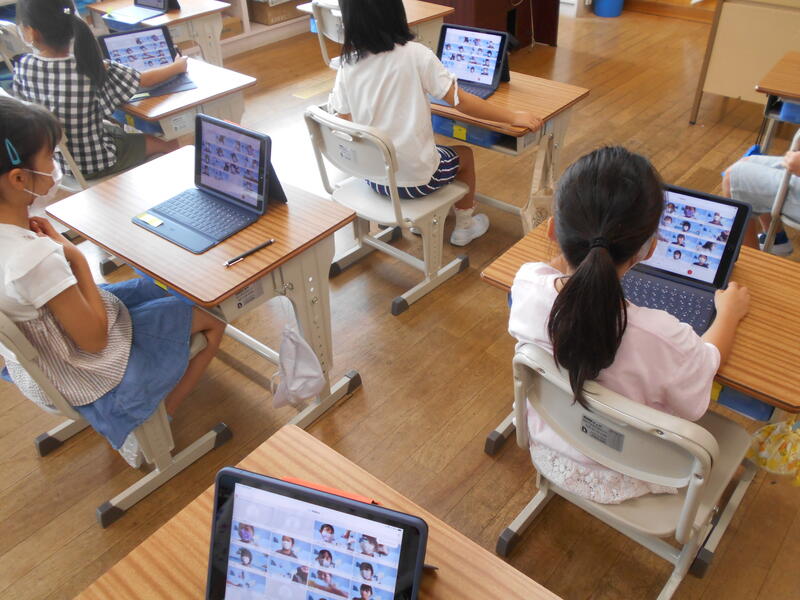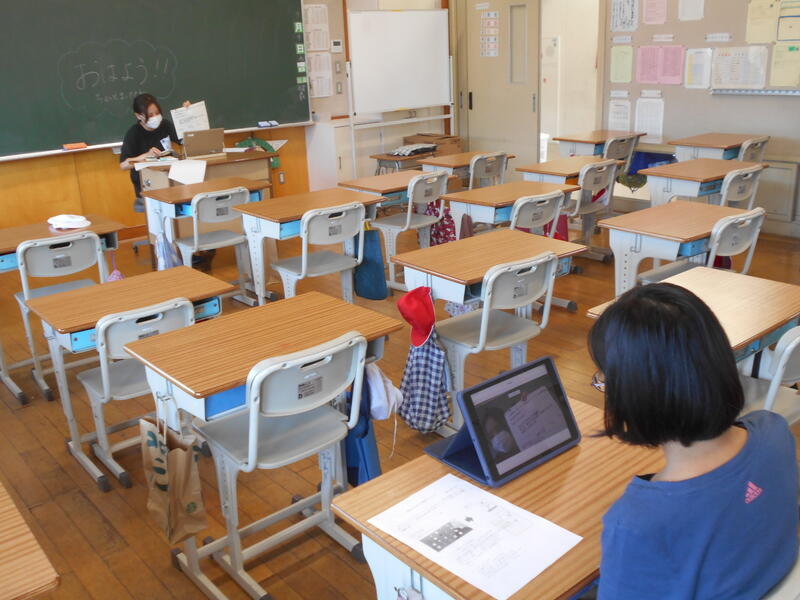 一人一台のタブレット端末を活用したオンライン授業の実施に向けて準備を進めています。まずは各学級で校内オンライン授業の試行を行います。さらに、学校から家庭の児童へ授業を配信する予定です。