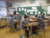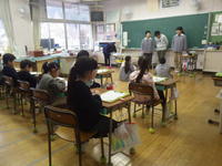 ◇2月26日、6年生はEAAの先生と最後の授業です。中学校で取り組みたい部活動などを、発音を聞き取ったり、伝えたりする学習をしました。写真は頭に手を付けていますが、お手上げなのではありません。目指す単語が聞き取れたら机の上の消しゴムを取り合うアクティビティです。1年間、楽しい授業をありがとうございました。