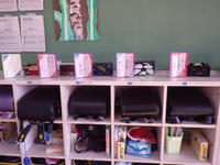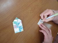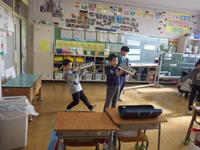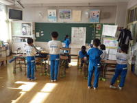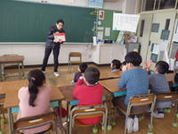 EAAの先生と動きのあるアクティビティを行いながら学習します。また、学校司書の先生には、読み聞かせをしていただきました。毎回お土産をいただくのですが、折り紙の「おまもり」を手にした1・2年生はさっそく願い事を考えていました。
