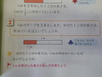 ◇3年生は整数・小数をすでに学んでいます。等分してできる部分の大きさや端数部分の大きさを表すのに「分数」を用いることを学び始めました。1mを等分した長さのあらわし方を友達と考え、まとめていきます。