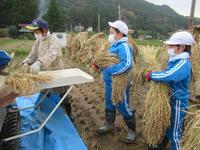 ◇10月24日、3・4年生が学校田の稲の脱穀を行いました。台風19号の被害も、週末の雨の被害もなく、無事に脱穀することができました。子どもが、自分で、大きな音の出る機械を使うという経験はなかなかありません。稲わらから米が分離する、籾殻が舞う、それを体感する…とてもすばらしい経験です。米粒となるまでの道のりや、残ったわらの処分方法など、これからも学ぶことはたくさんあります。
