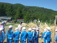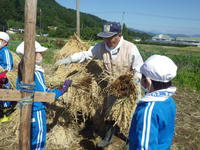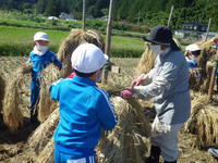 ◇10月1日、3・4年生は実穂返しをしました。学校田には棒かけをした稲が干してあります。その稲の上下を返して棒に掛け直し、乾燥させるための作業です。特別非常勤講師の佐々木さんに教えていただきながら作業を進めました。落穂もすべて拾います。台風に負けませんように、子どもたちの願いがこもります。
