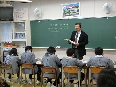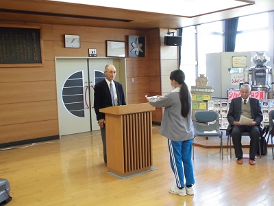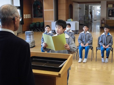 3月6日(火)、佐原小学校同窓会長佐藤冨雄様をはじめ、6名の役員の皆様のご臨席の下、6年生5名が、伝統ある佐原小学校同窓会に入会いたしました。多くの立派な先輩方を輩出した佐原小学校の同窓生として、これからもがんばって勉学に励んで欲しいとのお話がありました。代表が入会の言葉を述べ、立派な態度で式に臨むことができました。