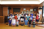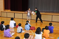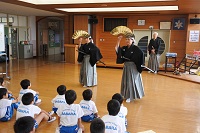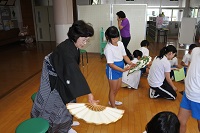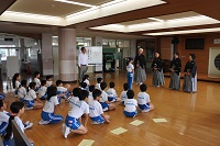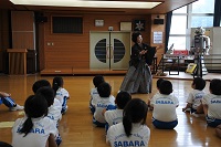 聖月流日本吟剣詩舞道会福島支部から菅原弘月さん、大越豊月さん、伊藤千月さん、亀岡榮月さんの4名をお迎えして、吟と詩舞と剣舞を見せていただきました。子どもたちにとって、初めての経験でした。扇子や剣の使い方も教えていただきました。
