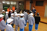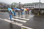 佐倉駐在所のおまわりさんに来校いただき、6年児童が「家庭の交通安全推進員」の委嘱を受けました。その後、通学班ごとに、実際に雨の中を歩行し、訓練しました。