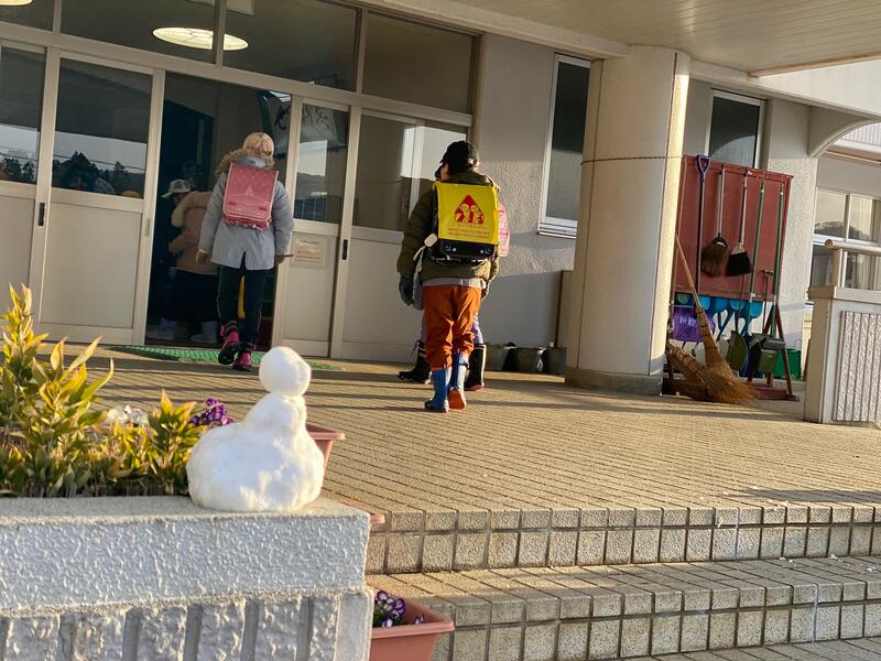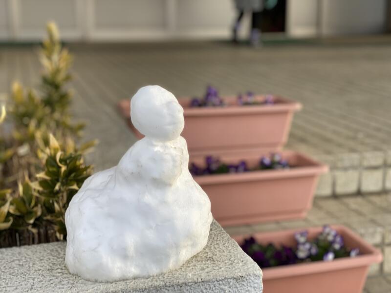 昨日の子供たちの雪遊びの跡が正面玄関に残っていました。小さな雪だるまです。今朝、登校してきた1年生が雪だるまの上に、もう一つ雪つぶてを重ねていました。