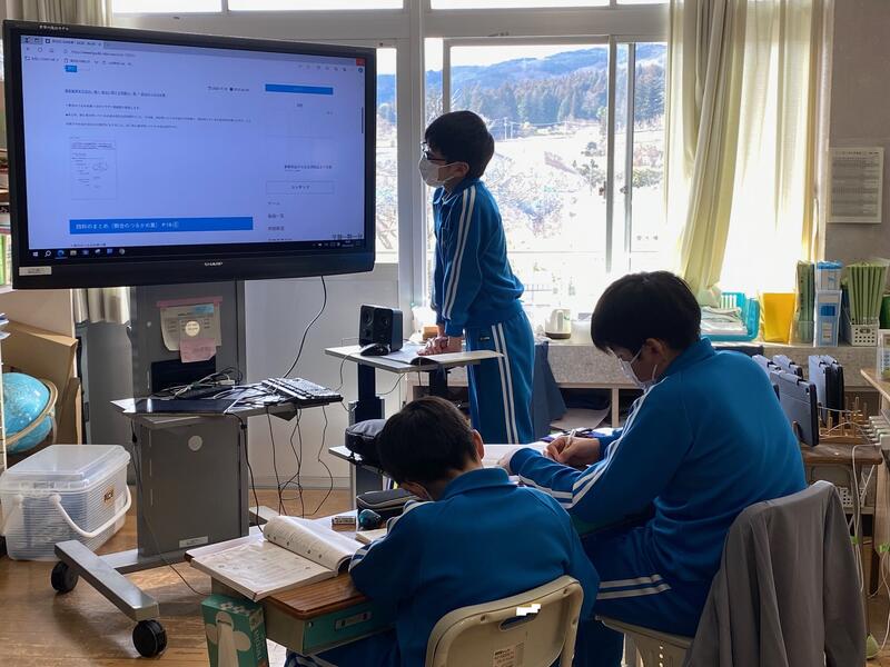 なわとびの練習が終わると、すぐに気持ちを切り替えて学習もできます。5.6年生は社会科の授業。歴史を学ぶ6年生は長く続いた戦争について教科書や資料を読み取っていました。