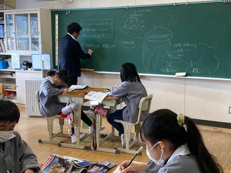 5.6年生教室では社会科。6年生が戦時中の様子を資料から調べている間、先生と5年生はコンビニエンスストアを例に情報活用について話し合っていました。