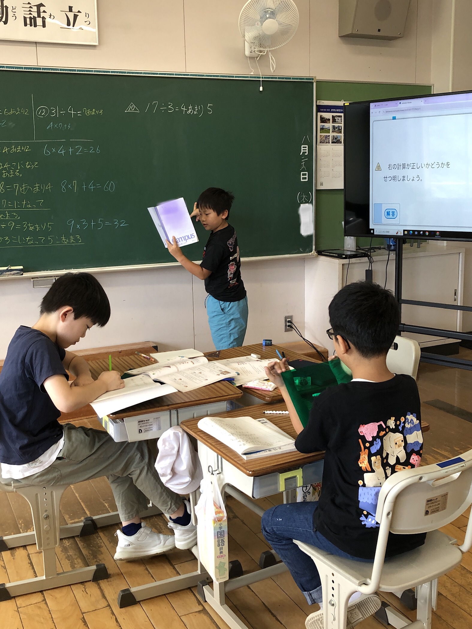 低学年教室は、授業中。生活科の学習で思い出に残っていることを絵に描きました。