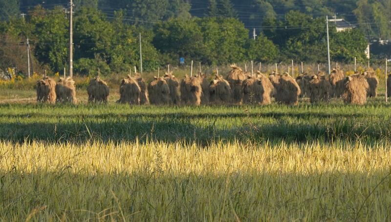 稲架に掛ける(はさにかける)とは、収穫した稲を棒に掛けて、天日干しをすることです。