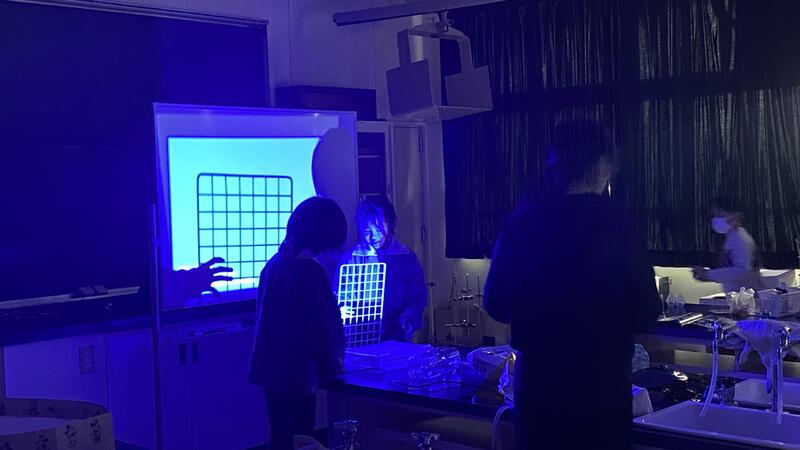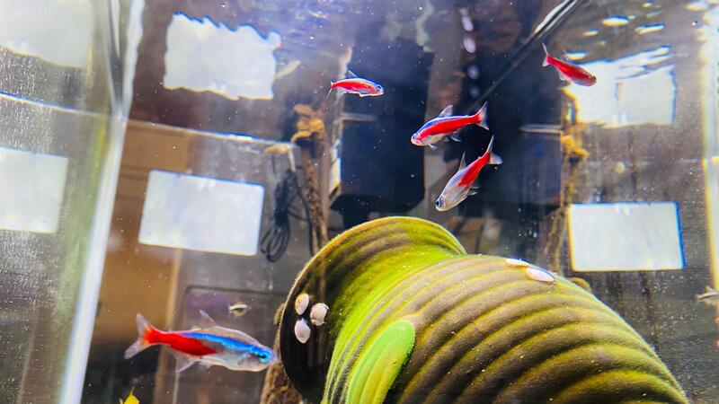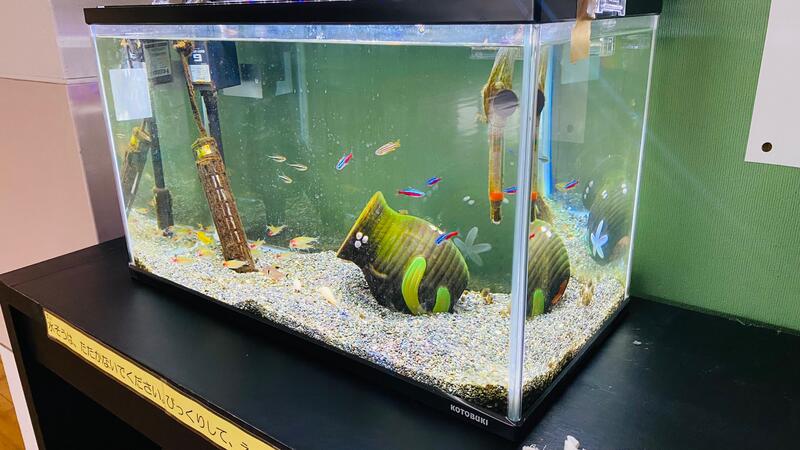 今日はいつもより暗い校舎内ですが、見回ると何気にキレイと感じた場所がありました。ひとつは水槽。子どもたちが通りかかると目を向ける水槽です。明りに照らされた魚がキラキラとしていました。