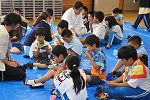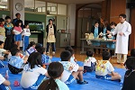 お昼みの時間に歯科の校医の先生と歯科衛生士の3人のお姉さんに歯みがきについて