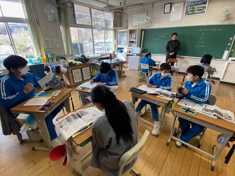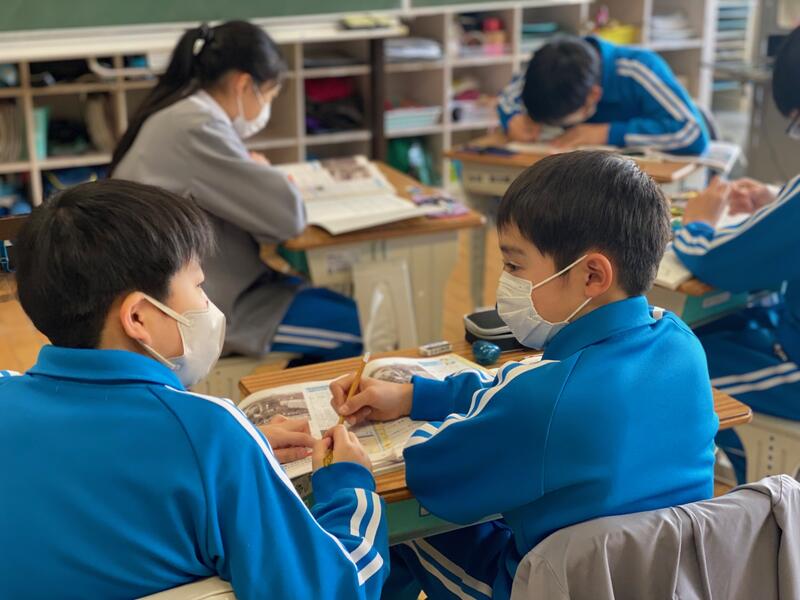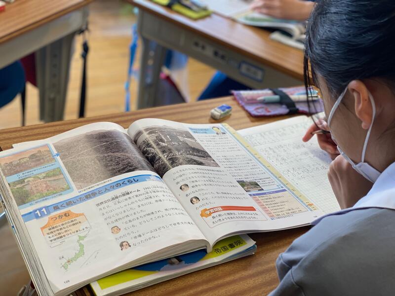なわとびの練習が終わると、すぐに気持ちを切り替えて学習もできます。5.6年生は社会科の授業。歴史を学ぶ6年生は長く続いた戦争について教科書や資料を読み取っていました。