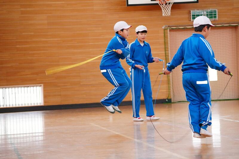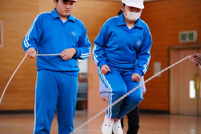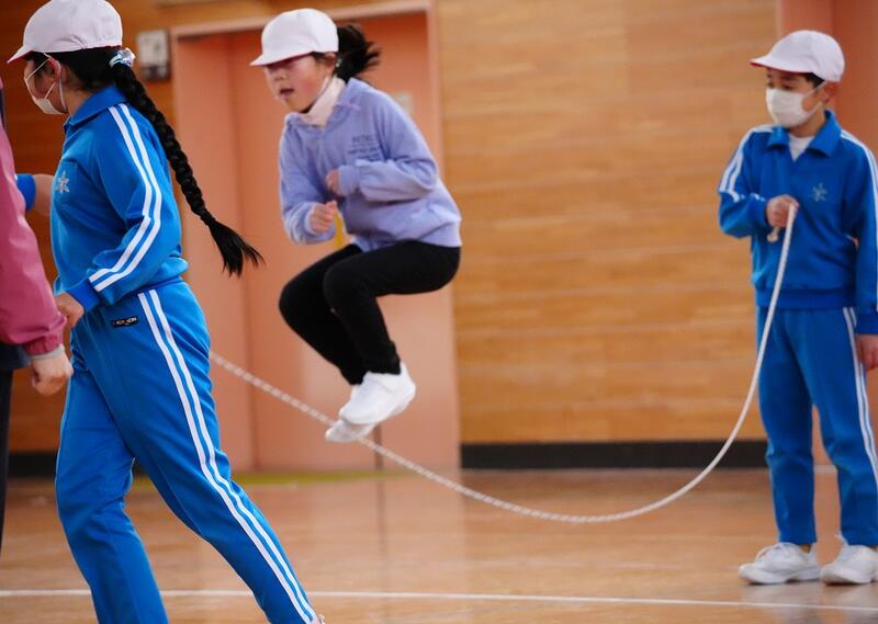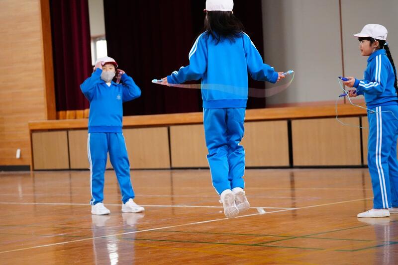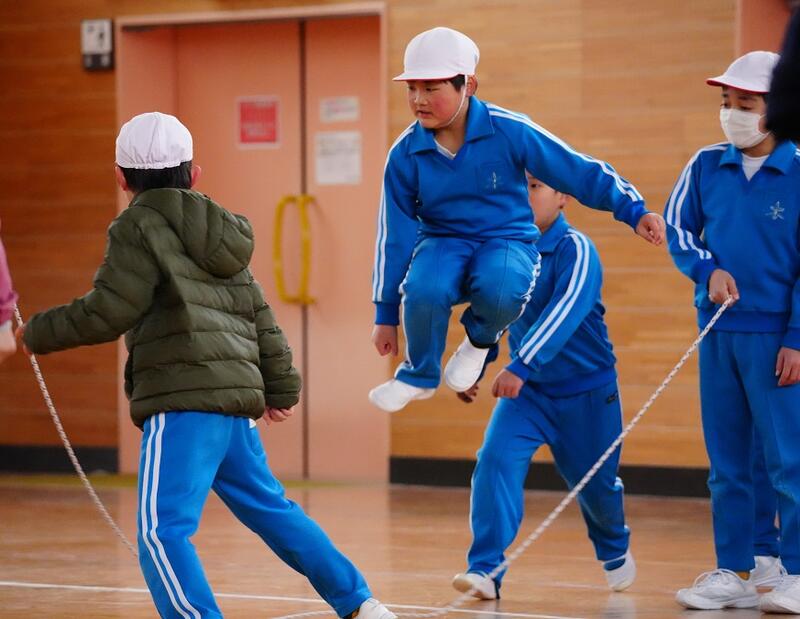 業間には、気温が5度にも満たない冷えた体育館で、縄跳び運動にも取り組んでいました。個別の練習の後は、ふた組に分かれて長縄跳びの練習もしています。