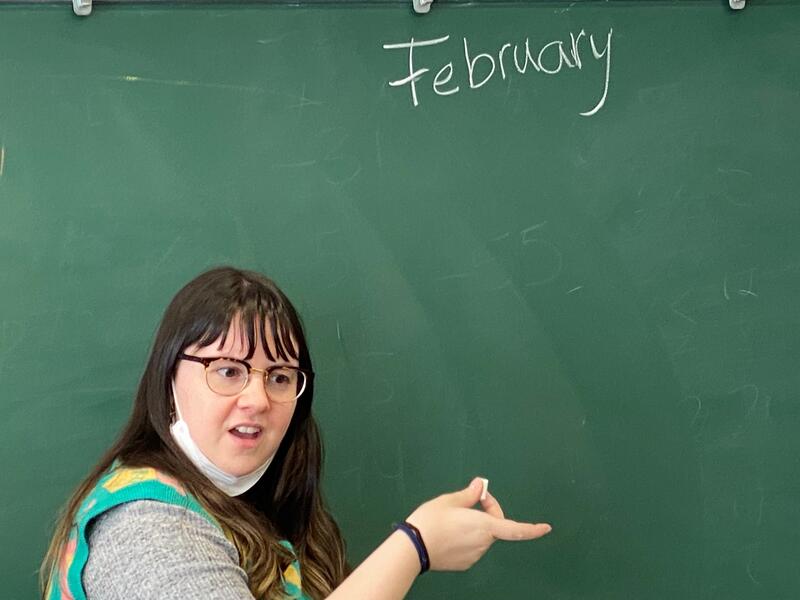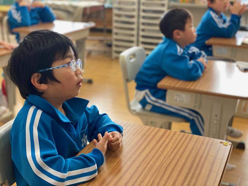 授業になると気持ちを切り替えてしっかりと学習。1.2年生は、ALTから2月の発音をまねていていました。
