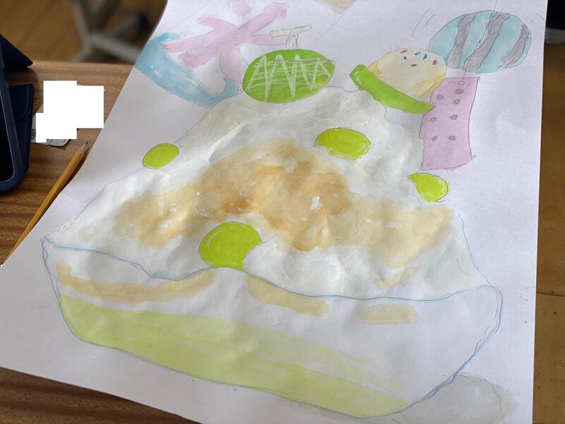 おやっ、絵の中に色付けが柔らかくてふんわりとしたかき氷をみつけました。( ^)o(^ )