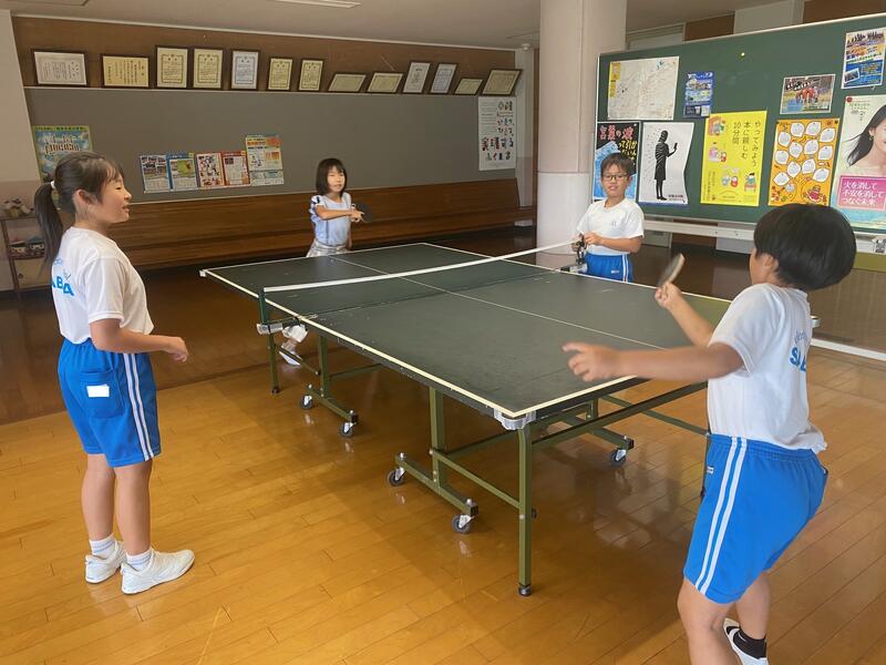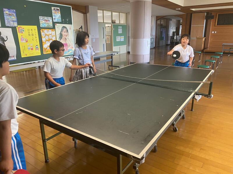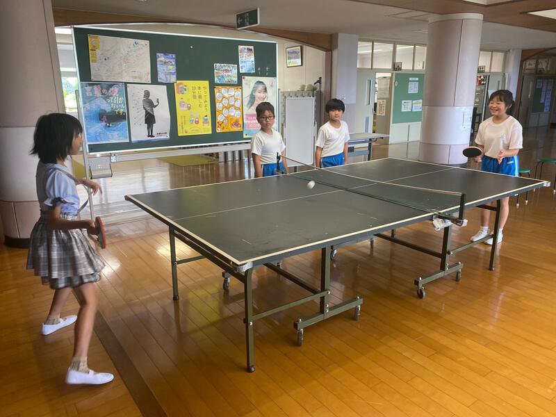 2時間目が終わって休み時間になると、卓球台に子どもたちがやってきました。得点を取ると続け、取られたら交換と暗黙のルールが出来上がっているようで、楽し気にやっていました。