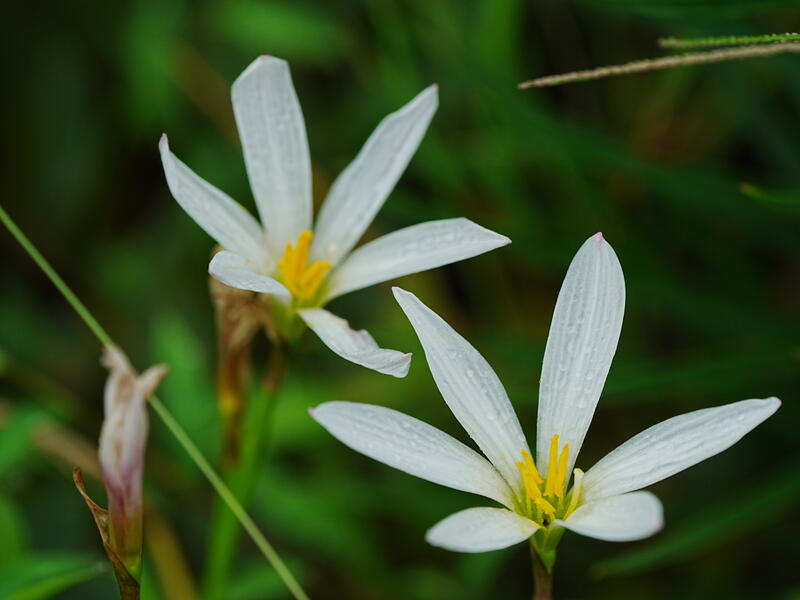 すらりとした真っ白い花びらが印象的です。玉簾はレインリリーとも呼ばれます。この花は夏の日照りで乾燥した後に花びらが開く性質があるそうですから、ちょうど今朝がいいタイミングだったのでしょうね。