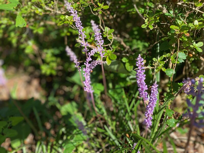 道端に藪蘭(やぶらん)が咲いていました。和名より学名のリリオペとか、英名のサマームスカリのほうが響きがいい名前かもしれませんね。