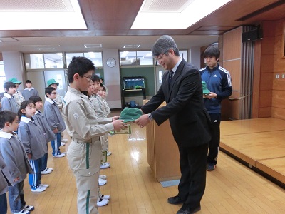 本校の緑の少年団は、1年生から6年生の31名が団員です。今回、中心となり活動をする5年生に、緑の帽子が渡されました。