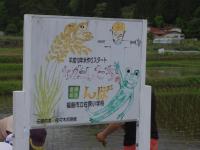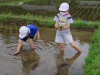 はじめは、「冷たい」と言って恐る恐る入ったり、足がなかなか抜けずに転びそうになったりしながらも、分担を決めて田植えを行うことができました。終わった時の表情は、満足感に包まれていました。