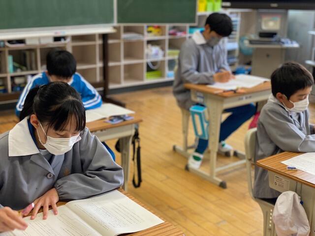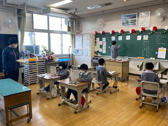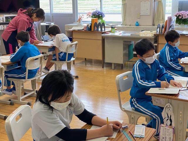 さて、本校は児童数が少ないことから、1年生と2年生、3年生と4年生、5年生と6年生が同じ教室で学習しています。同じ教科の時間でも内容が異なるときは、一人の先生が時間をずらし学年をわたって指導しています。