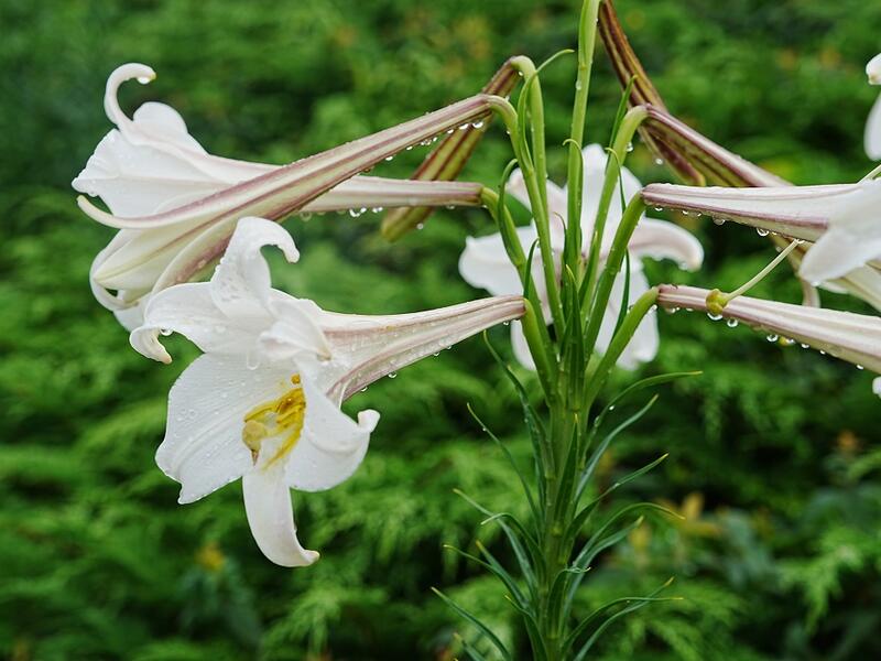夏の朝、草木に降りている露のことです。今朝は、ユリにまとわりつく露がこの暑い夏に少し涼しさを感じさせてくれました。