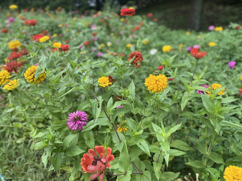 写真は同じキク科のダリア。赤、桃、黄、白と色ちがいで一緒に咲く様子は、仲のよい友達に見えてきます・・・