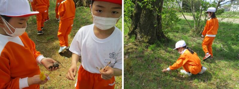 4年生 理科「天気と1日の気温」 温度計を使って気温を計ったり、春の植物を調べたりしていました。
