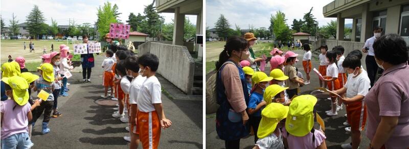 最後に2年生から園児に対して、メッセージを書いた大きなカードを送りました。1年間お世話になりました。