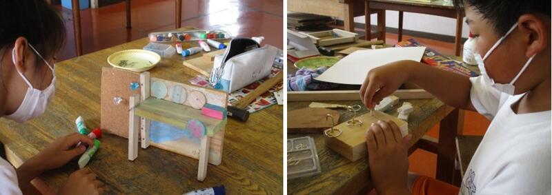図画工作クラブでは、制作したピタゴラスイッチで遊んだり、プラ板を作る体験をしたりしていました。