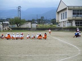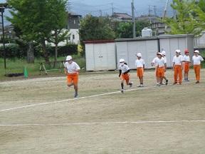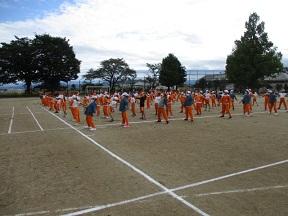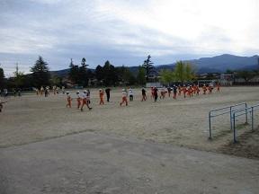 2年生は内側を5年生は外側を走ります。5分間しっかり走って体力向上を目指します。