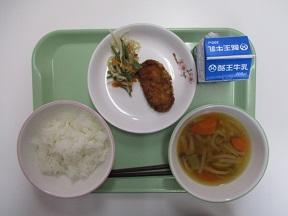 今日は「だいすきふくしまの日」です。福島県産豚肉を使ったわらじヒレカツに、甘辛いソースをかけました。ごぼうサラダのもやし、桃ゼリーの桃果汁も福島県産です。福島県のおいしい食材を味わいましょう。