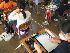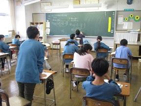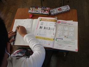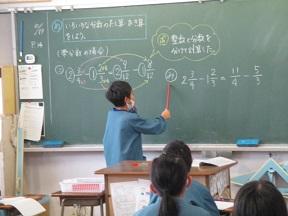 4年生は算数。「分母がちがう分数の大きさをくらべよう」というめあてで、学習していました。分母と分子の数字が大きくなっても同じ大きさになる場合があることについてしっかり学習していました。