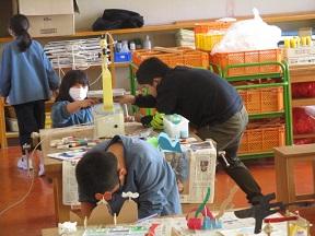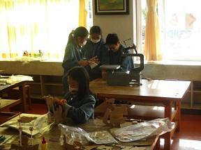4年生は図工室で工作に取り組んでいました。独創性あふれた車づくりに熱中していました。