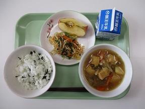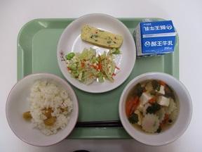 わかめご飯 かぶの味噌汁 五目厚焼きたまご こんにゃくのきんぴら